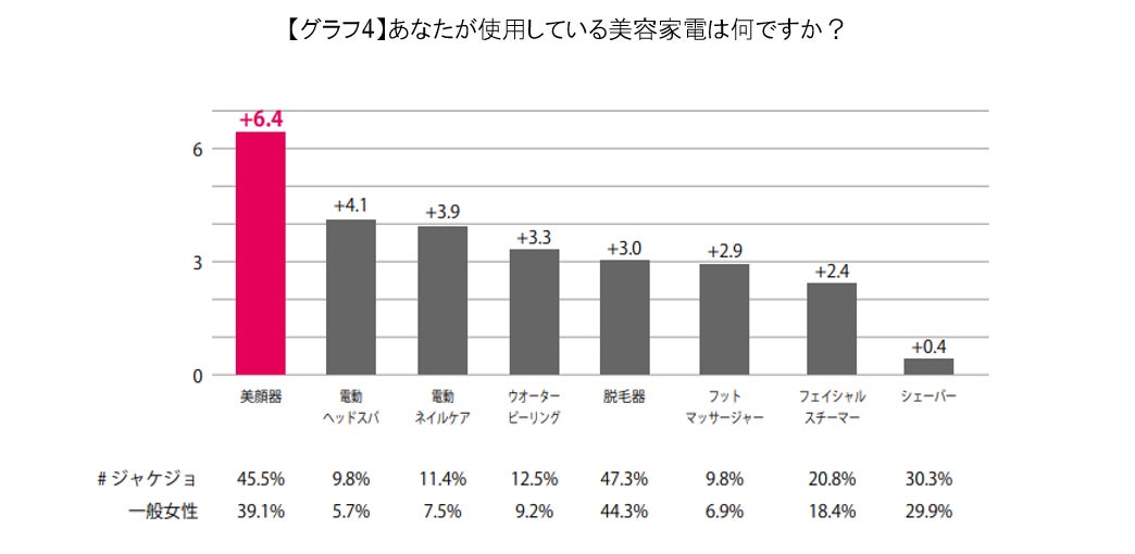 また、「使用している美容家電」に対し、「美顔器」と回答した#ジャケジョは一般女性より6.0ポイント高い結果となり、根本的な美しさを求め、努力を惜しまないことがうかがえます(グラフ4)。