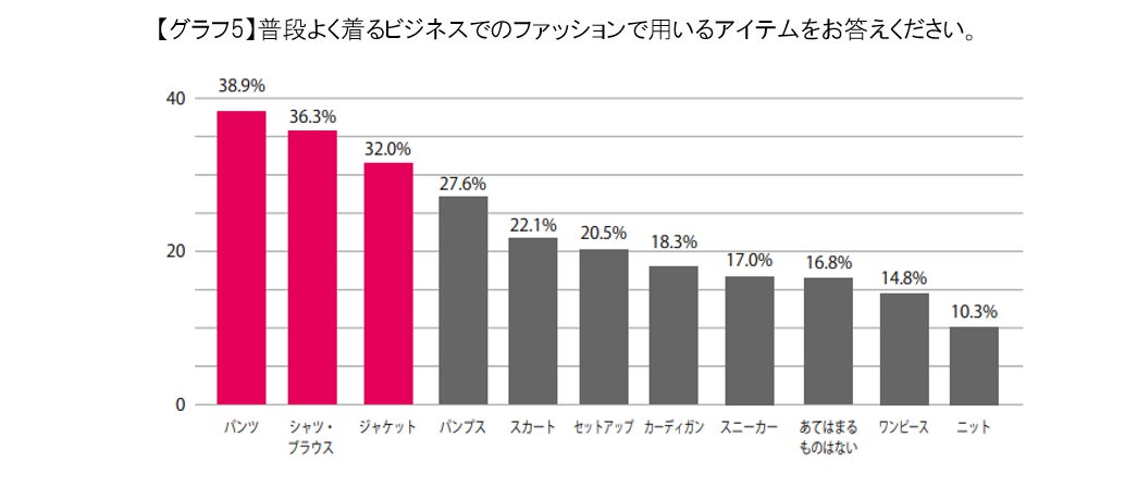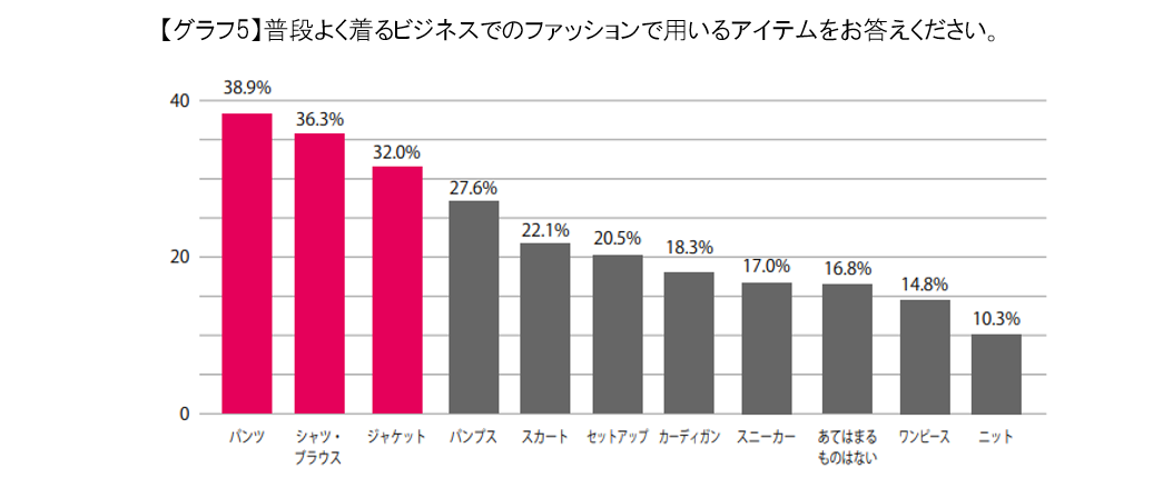 #ジャケジョに「普段よく着るビジネスでのファッションで用いるアイテムをお答えください」という質問をしたところ、第1位が「パンツ」(38.9%)、第2位「シャツ・ブラウス」(36.3%)、第3位「ジャケット」(32.0%)という結果となりました(グラフ5)。