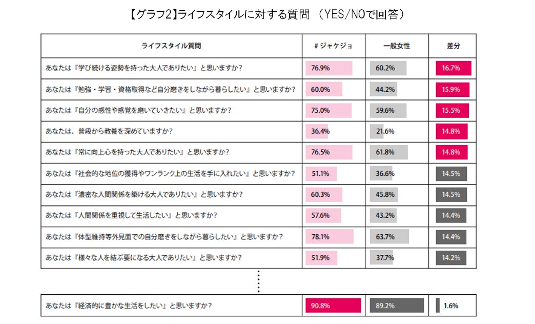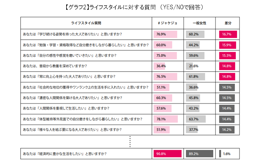 また、ライフスタイルの質問(約100問)のうち、『経済的に豊かな生活をしたい』の項目が最も高く、さらに#ジャケジョと一般女性を比較したところ、豊かな生活を送るための「向上心・向学心」「ON/OFF両立」「内・外見の自分磨き」などの項目でその差が大きいことから、資格取得や感性・教養を高めることに意欲的であることがわかります(グラフ2)。