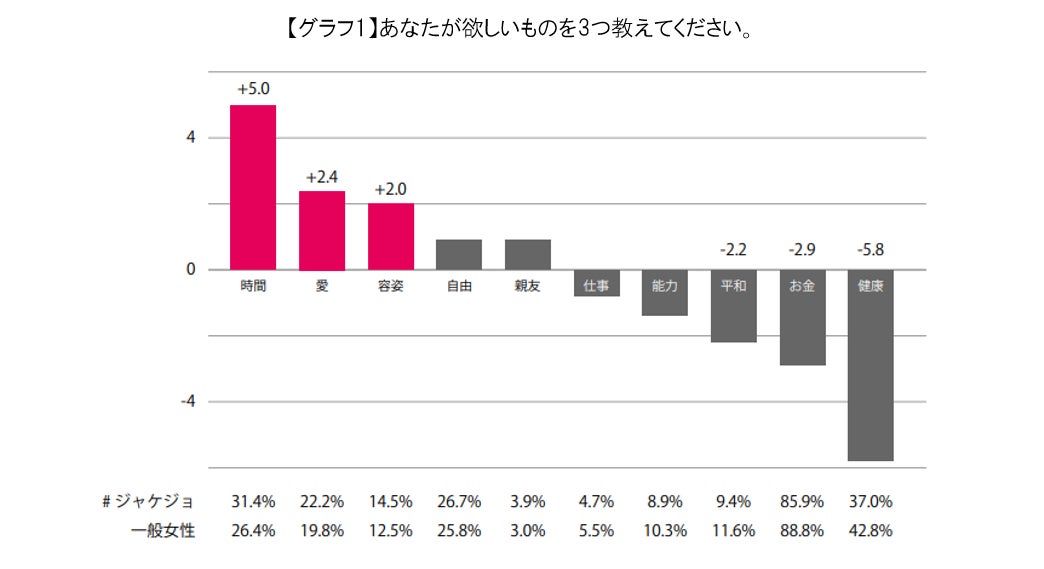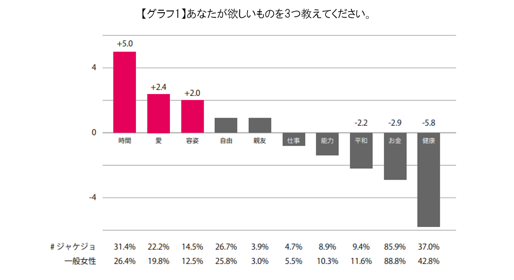 「あなたが欲しいものを3つ教えてください」という質問に対し、その差分ポイントより、#ジャケジョは一般女性以上に「時間」「愛」「容姿」などQOLの向上に対する意識が高いことが判明しました(グラフ1)。