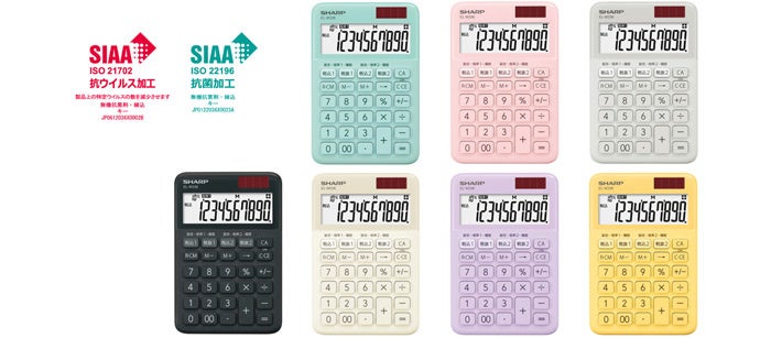 本機は、キー表面に付着した特定ウイルスの数を減少させる「抗ウイルス加工」を施した電卓として業界初の「SIAAマーク」認証を取得。細菌の増殖を抑制する「抗菌加工」による認証も取得しています。また、インテリアやファッションで人気の高い「くすみカラー」を基調に、液晶表示周りのパネルの光沢仕上げと本体のマット仕上げを上下に組み合わせた、素材感にこだわったデザインを採用しました。