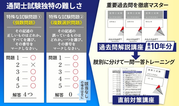 通関士試験は、問題の出題形式が特殊な試験です。正解の記述を全て選ばせる「複数選択問題」や、「該当なし」の場合は解答欄に「0」をマークさせる五肢択一式問題など、特殊な出題形式があるため、知識があっても問題が解けないという人が多いのが実情です。アガルートでは、最大10年分の過去問をご用意し、解法についても講師が丁寧に、順を追ってご説明します。