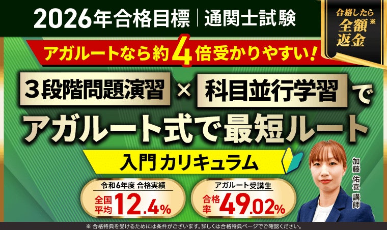 株式会社アガルート(本社:東京都新宿区、代表取締役:岩崎 北斗、以下「アガルート」)が運営する「アガルートアカデミー」は、【第60回(2026年)合格目標】通関士試験入門総合講義/入門カリキュラムをリリースいたしました。