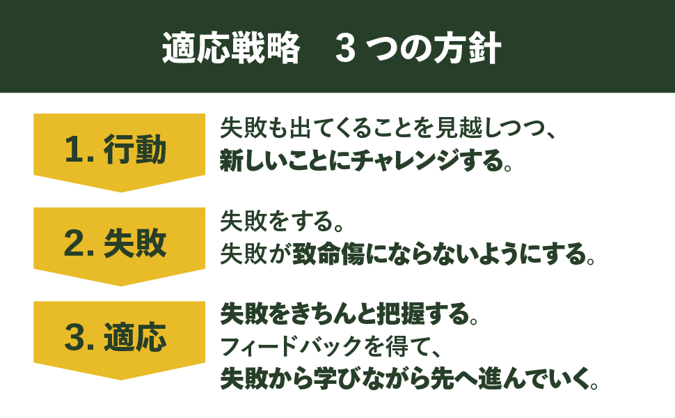 明確な戦略が見いだせない中で大切なのは、試行錯誤とフィードバックによる戦略をとることです。これは、生物の進化戦略をベースにした考え方で「適応戦略」と呼んでいます。