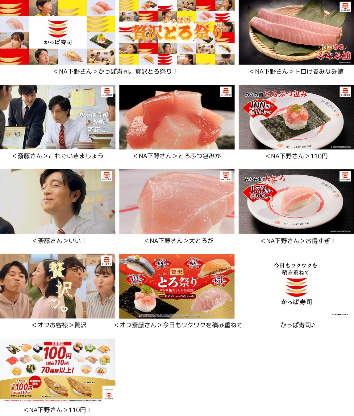 ・内容:かっぱ寿司の“挑戦部”社員と扮する俳優の斎藤工さんが、お客様の日々に寄り添い、もっと「ワクワク」をお届けするために、商品・企画案を練っていく内容となっております。『みなみ鮪とろぶつ包み』を食べ、「いい!」と思わず幸せそうな表情をみせる斎藤さんにも注目です!さらに、お寿司もサイドも110円で70種類以上!かっぱ寿司の挑戦も、ぜひチェックしてみてください!