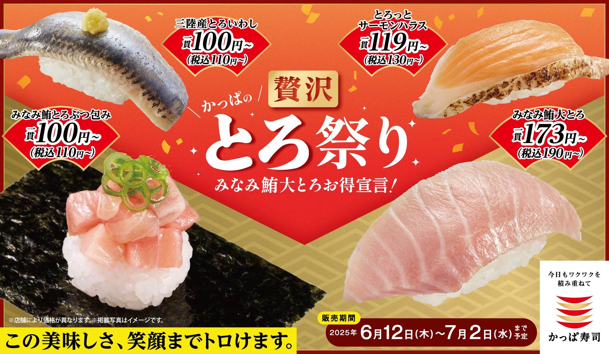 コロワイドグループのかっぱ寿司(カッパ・クリエイト㈱ 本社:神奈川県横浜市、代表取締役社長 山角豪)は、2025年6月12日(木)〜7月2日(水)の期間、『かっぱの贅沢とろ祭り』をかっぱ寿司全店にて開催いたします。