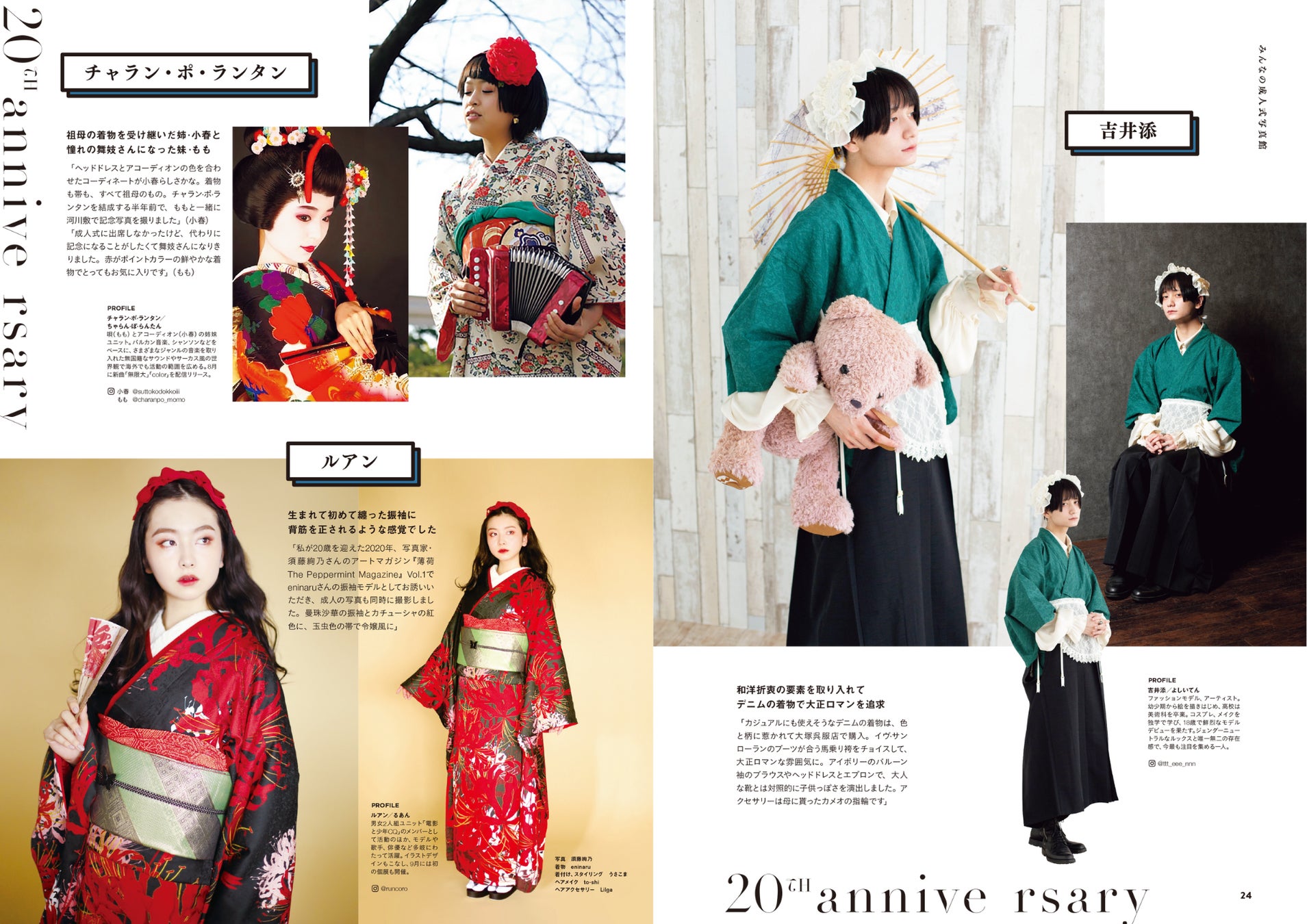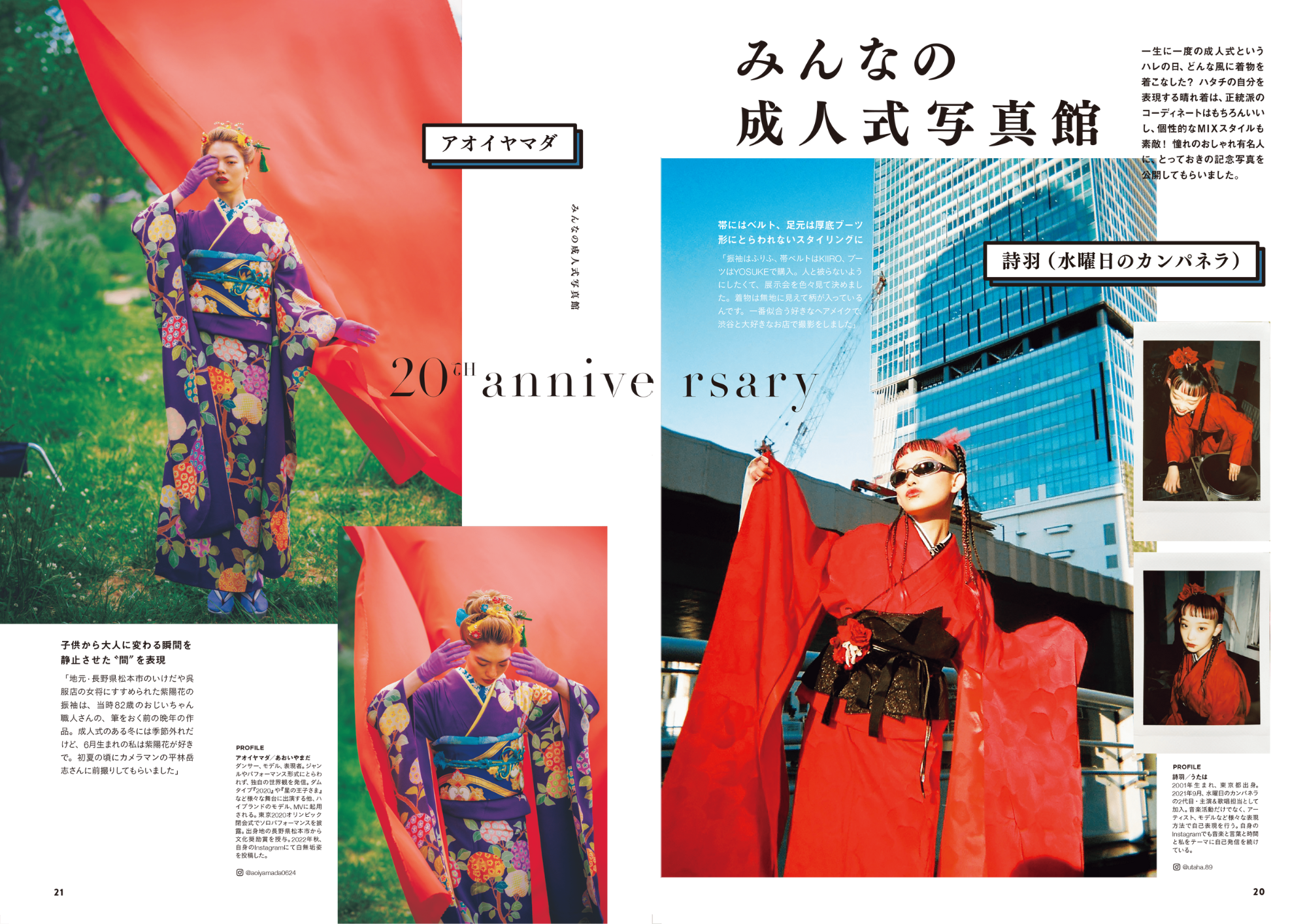 一生に一度の成人式。そんな特別な日を、どう過ごす? アイコニックなスターたちがとっておきの記念写真を公開! 水曜日のカンパネラの詩羽さん、アオイヤマダさん、甲田まひるさん、吉井添さんなど、みんなの気になるあの人が登場。