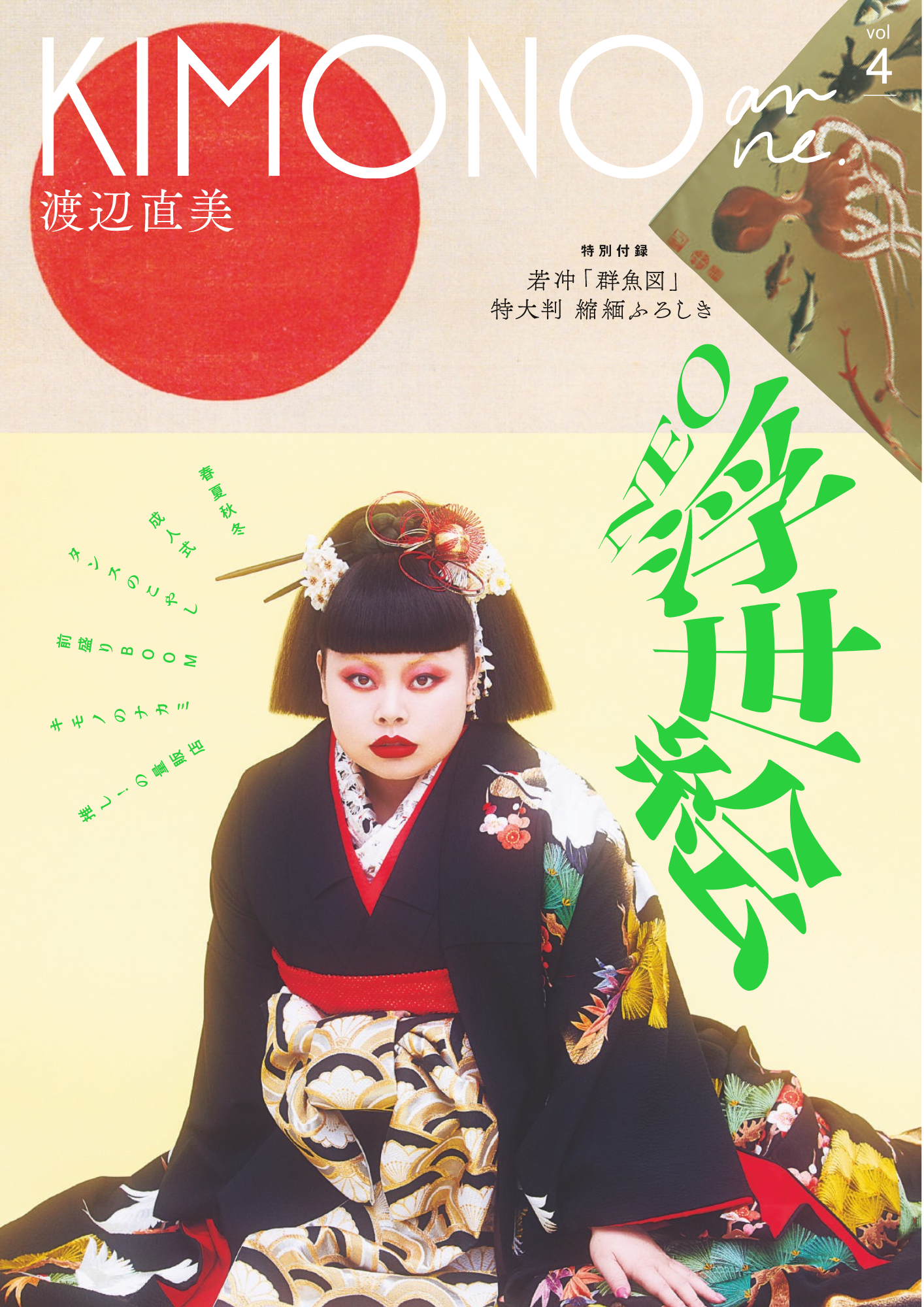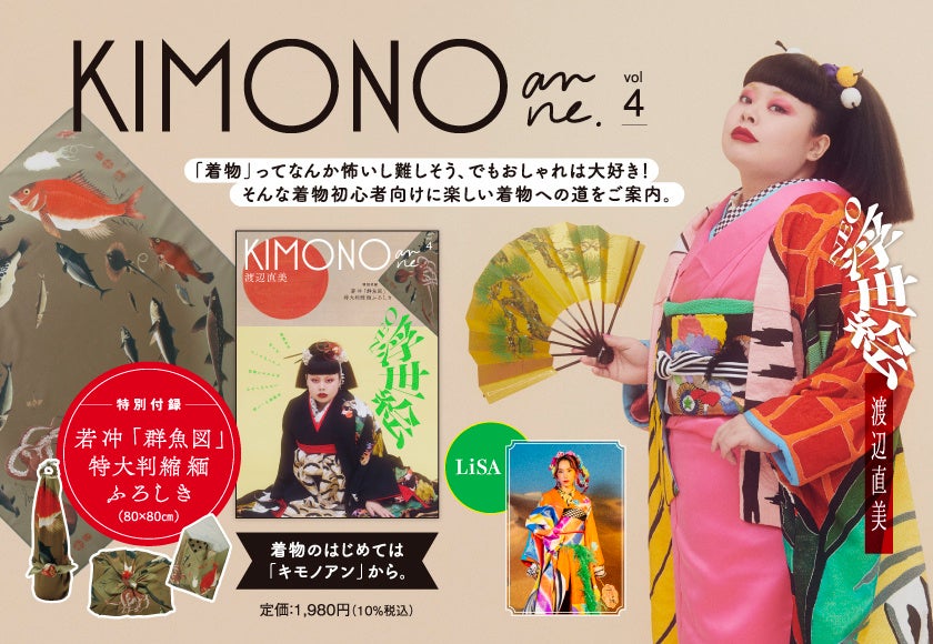 2019年創刊の『KIMONOanne.』(キモノアン)は、今号で4度目の刊行を迎えます。Vol.4では、アンティークをアヴァンギャルドに着こなす渡辺直美さんの「NEO浮世絵」をはじめ、アーティストやYoutuberが四季ごとのコーデを披露する「KIMONO quatre saisons」、スタイリッシュなあの有名人が当時の晴れ姿を公開する「みんなの成人式写真館」など、ページをめくりたくなる企画が満載。発売前から話題となった「群魚図」(伊藤若冲)の特大版縮緬ふろしきを特別付録につけ、全国書店にて発売いたします。