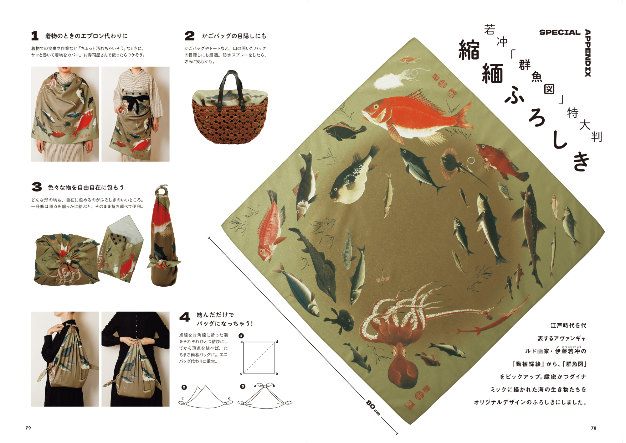 今号の付録は縮緬ふろしき。江戸時代を代表するアヴァンギャルド画家・伊藤若冲の「群魚図」をもとにしたオリジナルデザインでお届け。自由自在なふろしきは、エプロン代わりにしたりバッグにしたり、汎用性バツグン! どんなコーデにも意外とハマる優れもの。