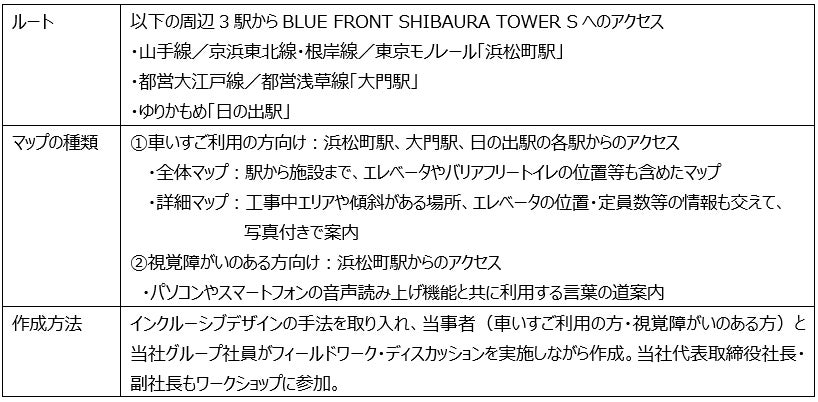 このたび、この取り組みの一環として、本年8 月より当社グループ本社を構える「BLUE FRONT SHIBAURATOWER S」に、障がいのある方が来館される際に役立つ「アクセシビリティ・マップ」を、インクルーシブデザインの手法を用いて作成し、「BLUE FRONT SHIBAURA」施設サイトおよび、当社コーポレートサイトにて初公開しましたので、お知らせいたします。