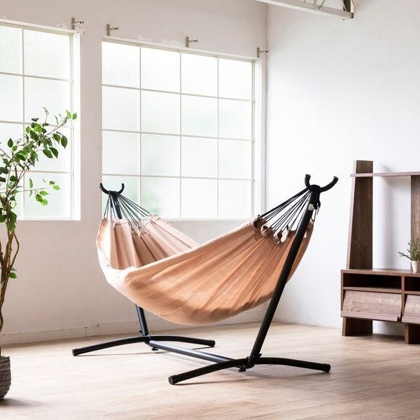 アウトドアはもちろん、おうちでも気軽に楽しめるハンモックとスタンドのセット。ハンモックはバリ島製で職人がひとつひとつ手作りしている逸品です。
