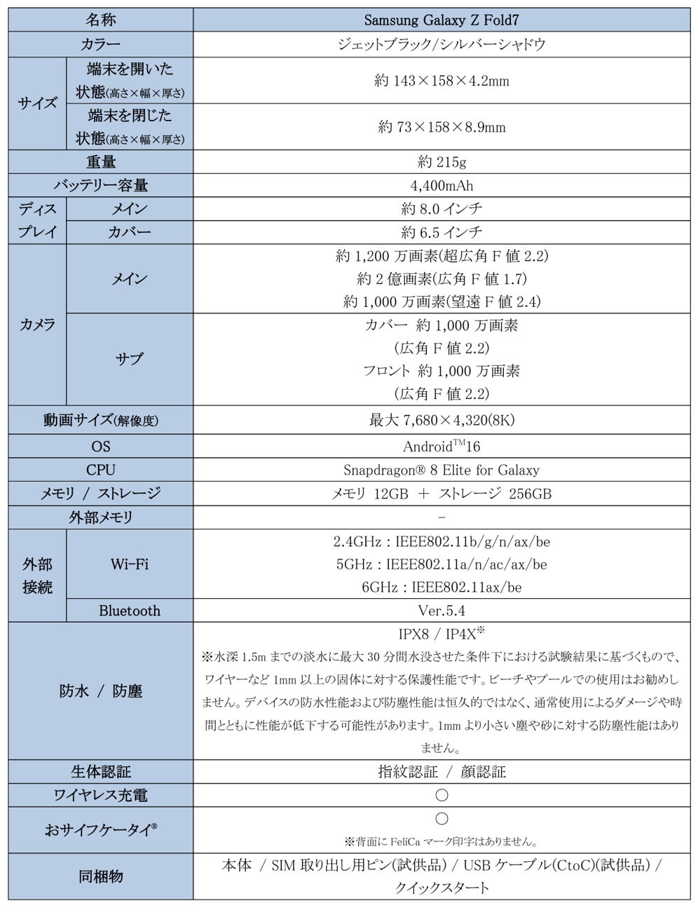 <主な仕様 : 「Samsung Galaxy Z Fold7」>