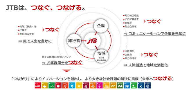 JTBグループは、旅行のお客様のみならず、企業や地域など、様々なお客様に対して「つなぐ、つなげる」ことを通じて、「旅で人生を豊かに」「コミュニケーションで企業を元気に」「人流創造で地域を活性化」することをめざしています。