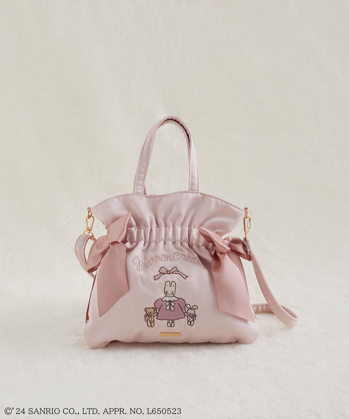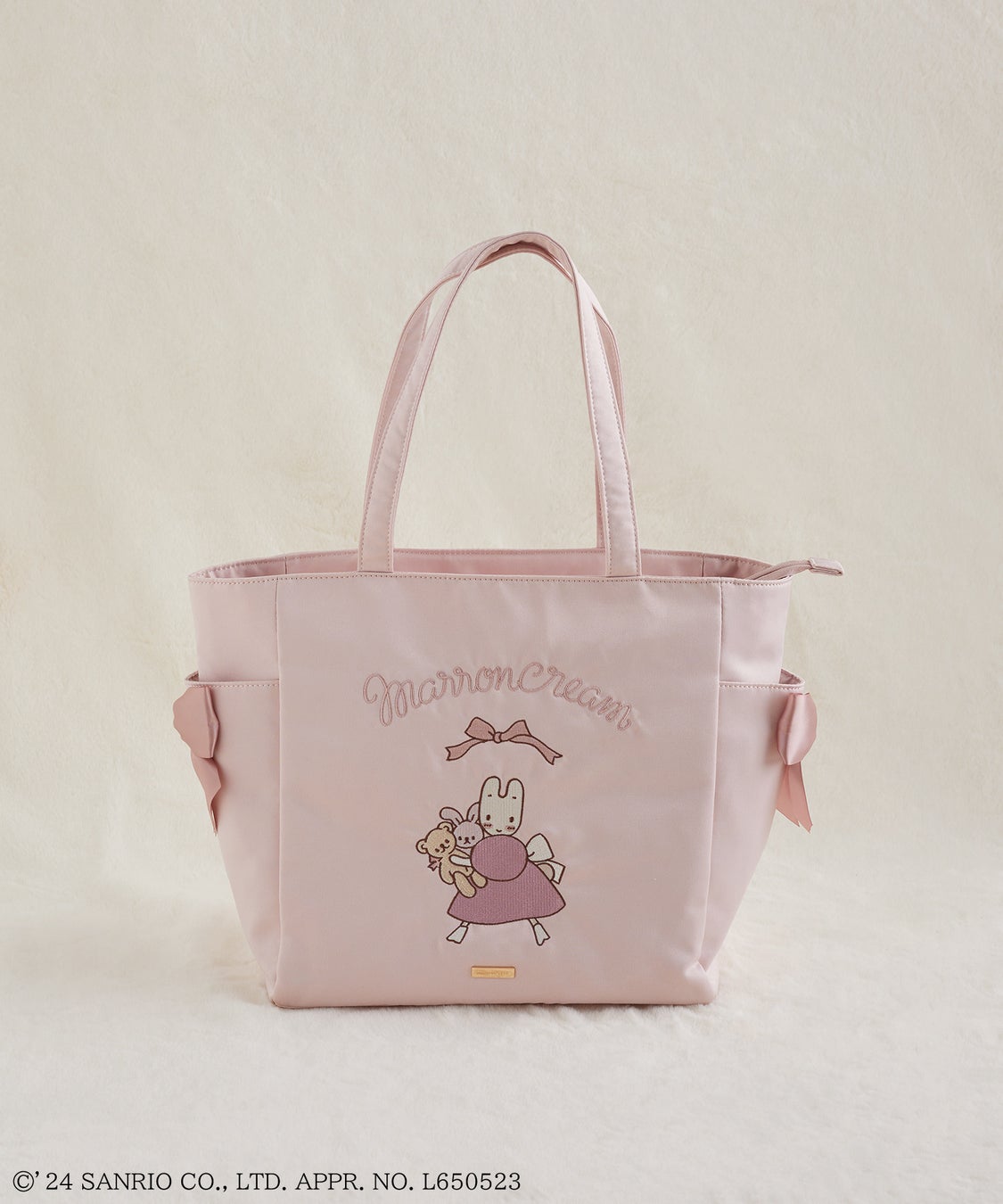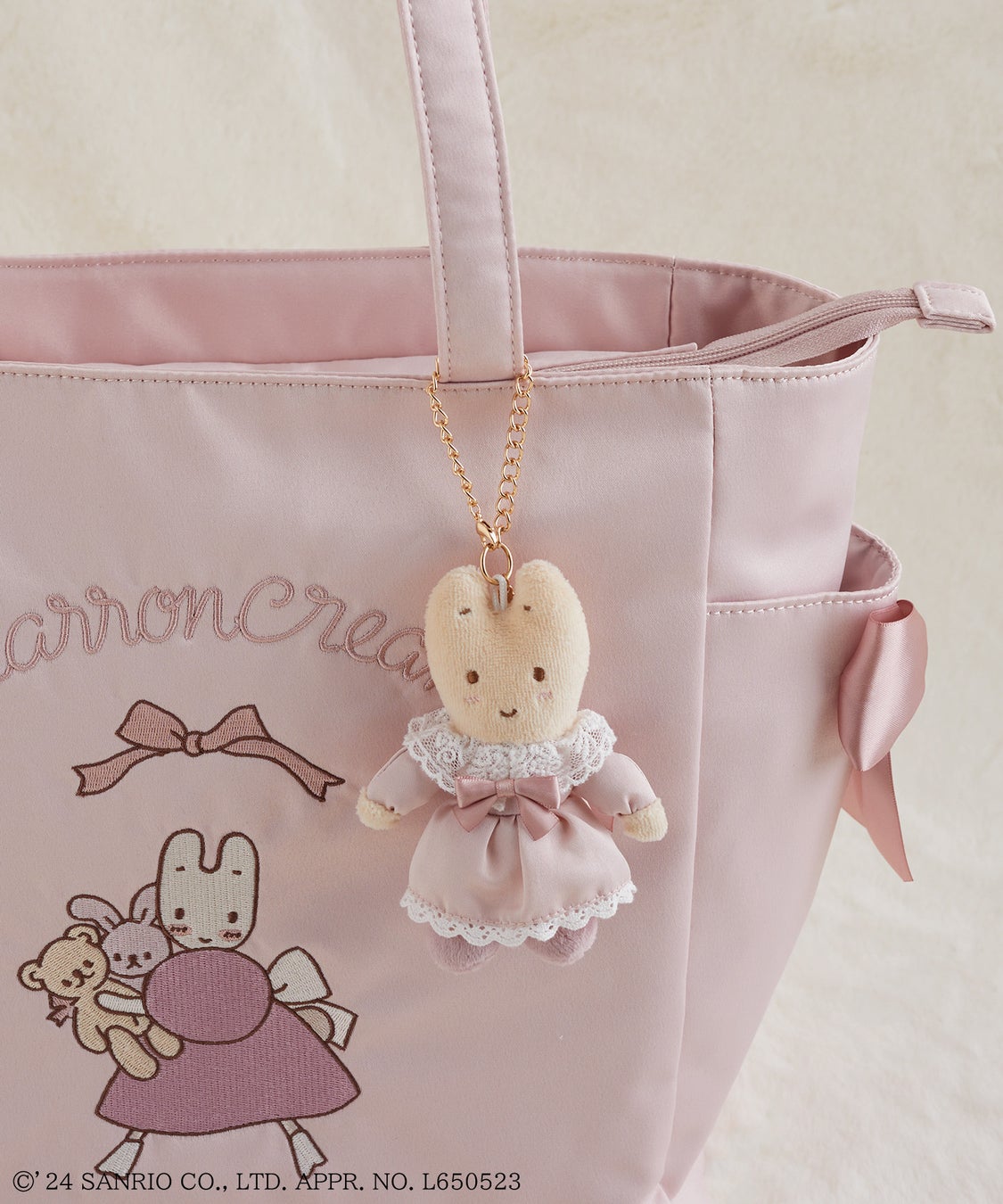 通勤や通学、旅行などにも活躍する大容量のトートバッグは、フロント部分にうさぎとくまを抱きかかえた「マロンクリーム」を刺繍。ブランドで人気の「ダブルリボントートバッグ」も、サテン素材に微配色のリボン、くすみカラーの刺繍をあしらった上品でガーリーなデザインに仕上げました。また、淡いピンクカラーのワンピースを着た可愛らしいマロンクリームのマスコットチャームもご用意し、バッグに付けてコーディネートをお楽しみいただけます。