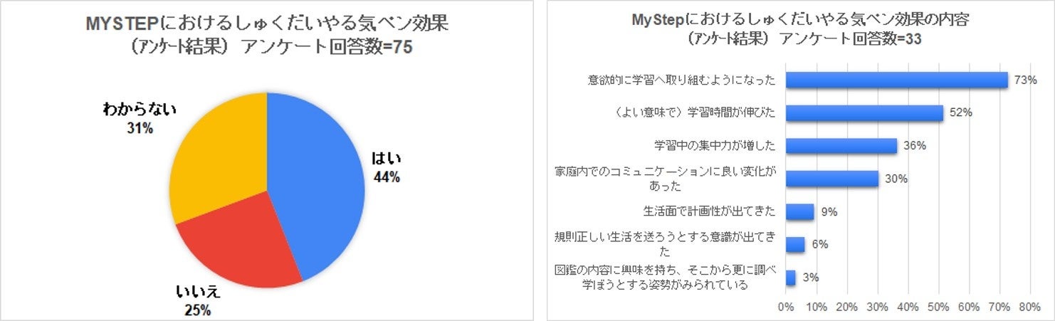 その結果、44%の児童の保護者が「明らかに効果があった」と回答しており、その効果の内容は「学習時の意欲が増した(73%)」「学習に取り組む時間が増えた(52%)」「家庭内でのコミュニケーションが良い変化があった(30%)」と、学習面にとどまらず、親子関係にも好影響をもたらすことが明らかになりました。