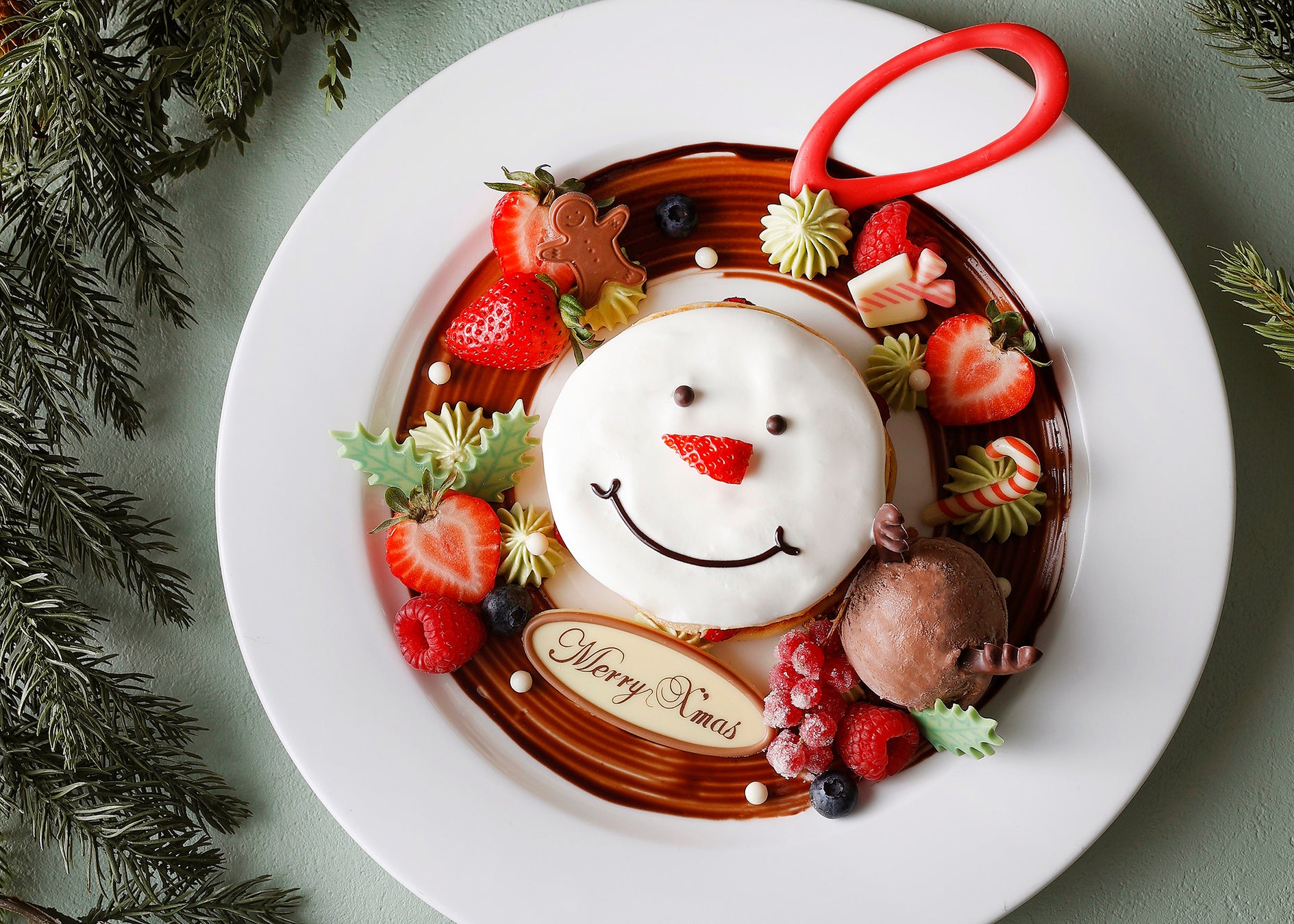 パンケーキはメープルシロップを加えたほんのり甘いしっとり生地で、フレッシュいちごと濃厚なカスタードクリームをサンドし、トップは滑らかなクリームで真っ白なスノーマンのお顔を描きました。お皿には、チョコレートソースでリースを作り、その上に小さく可愛らしいクリスマスオーナメントや、ヒイラギの葉のチョコレート、甘酸っぱいベリーを散りばめました。トナカイの耳をつけたチョコレートアイスものせて、パンケーキとフルーツ、アイスなど様々な食感や味わいもお楽しみいただけます。仕上げには、チョコレートで作ったフックも飾り、思わず手に取りたくなるようなフォトジェニックなパンケーキが完成。