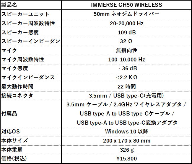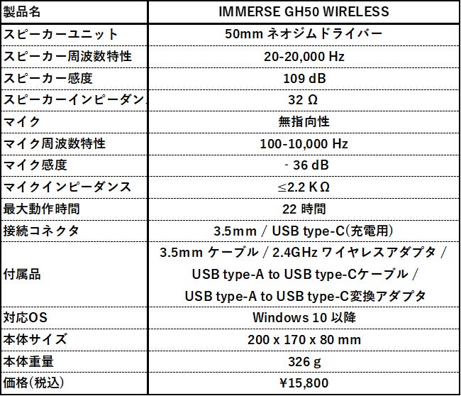 【IMMERSE GH50 WIRELESSの主な特徴】