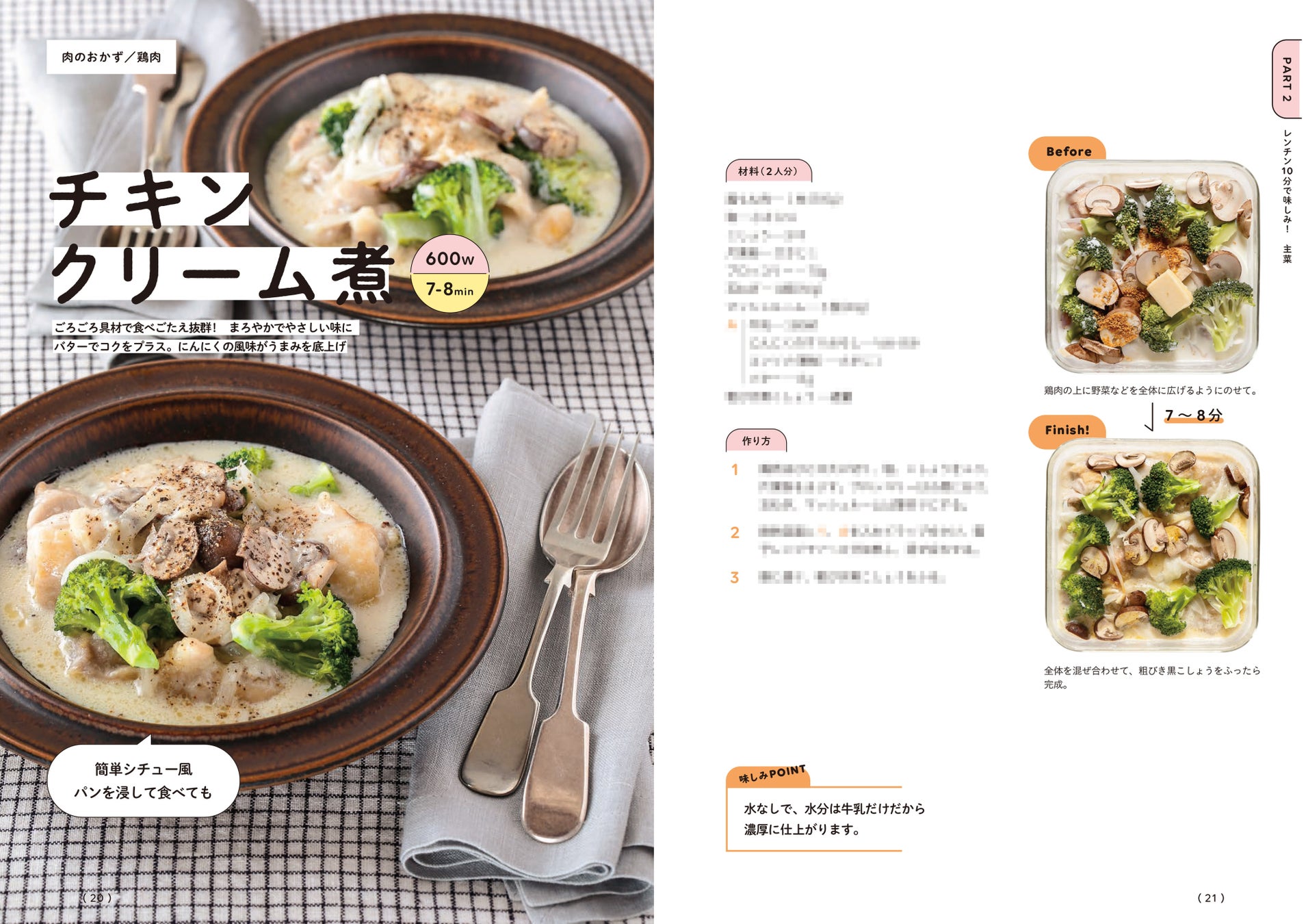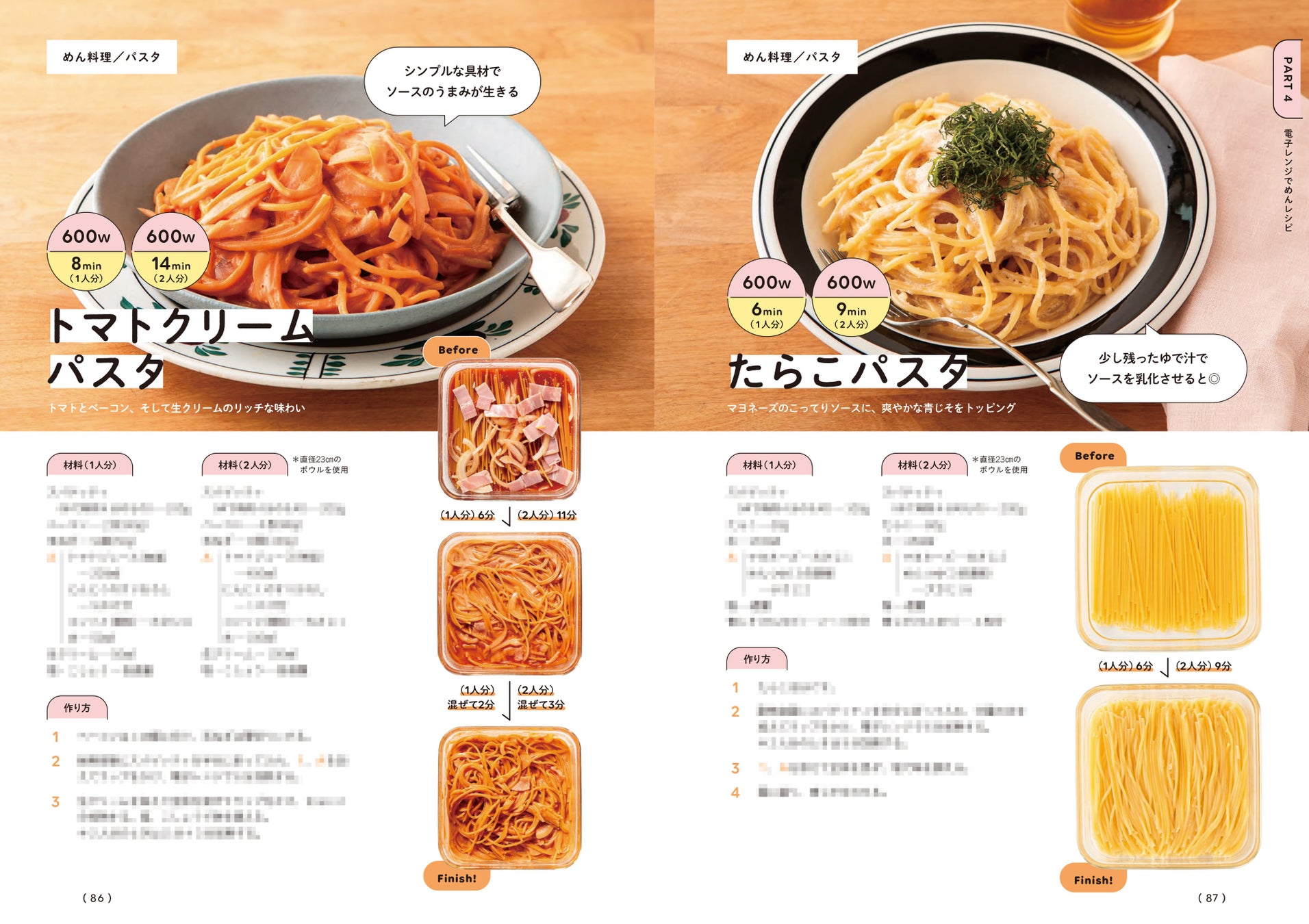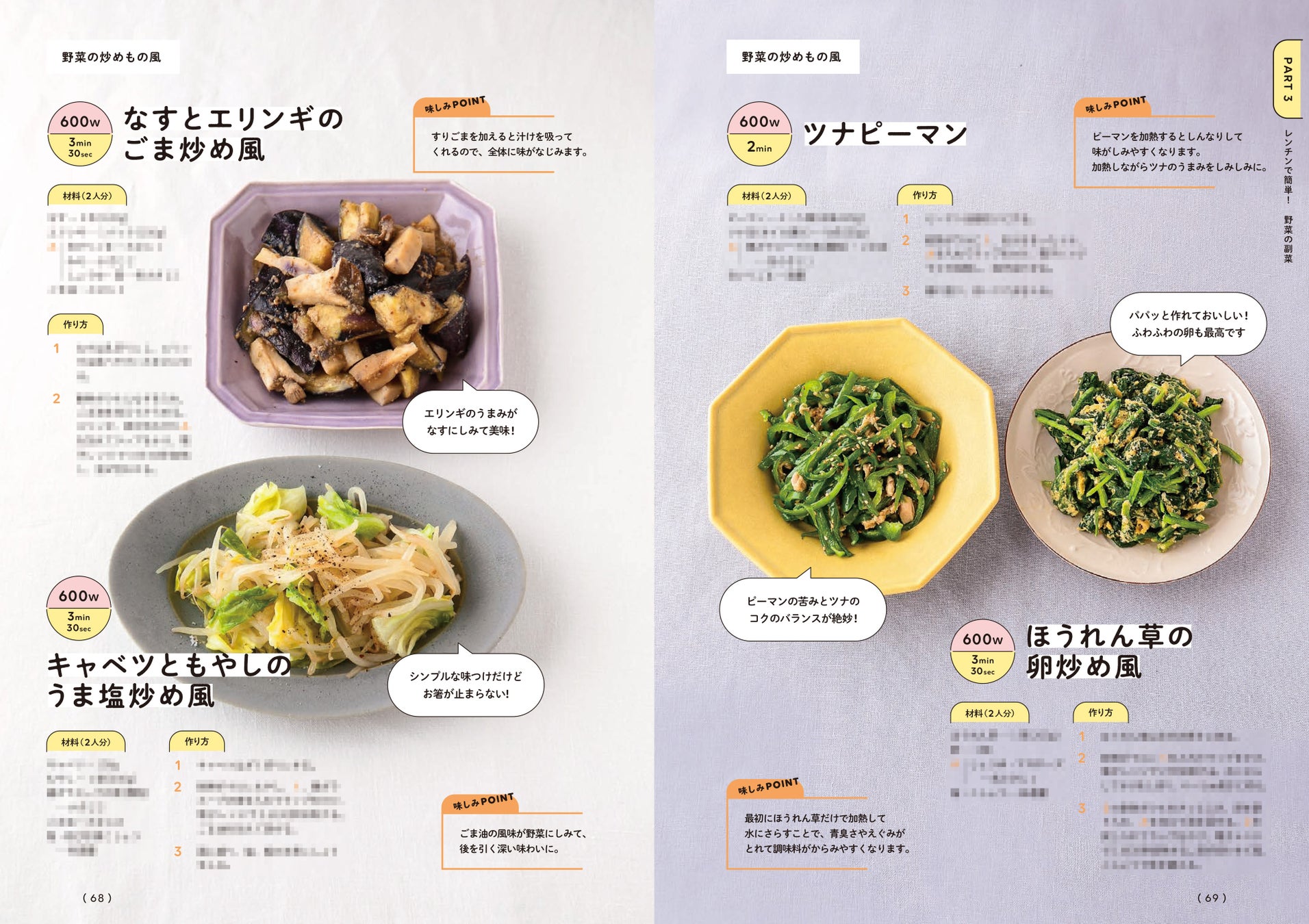 蒸し野菜はもちろん、野菜の煮ものや炒めもの風のおかずがレンチン1~5分程度で作れます。また、ランチにおすすめのパスタや料理も1人分と2人分の加熱時間を明記して紹介。毎日のごはん作りがラクになること間違いなしです。