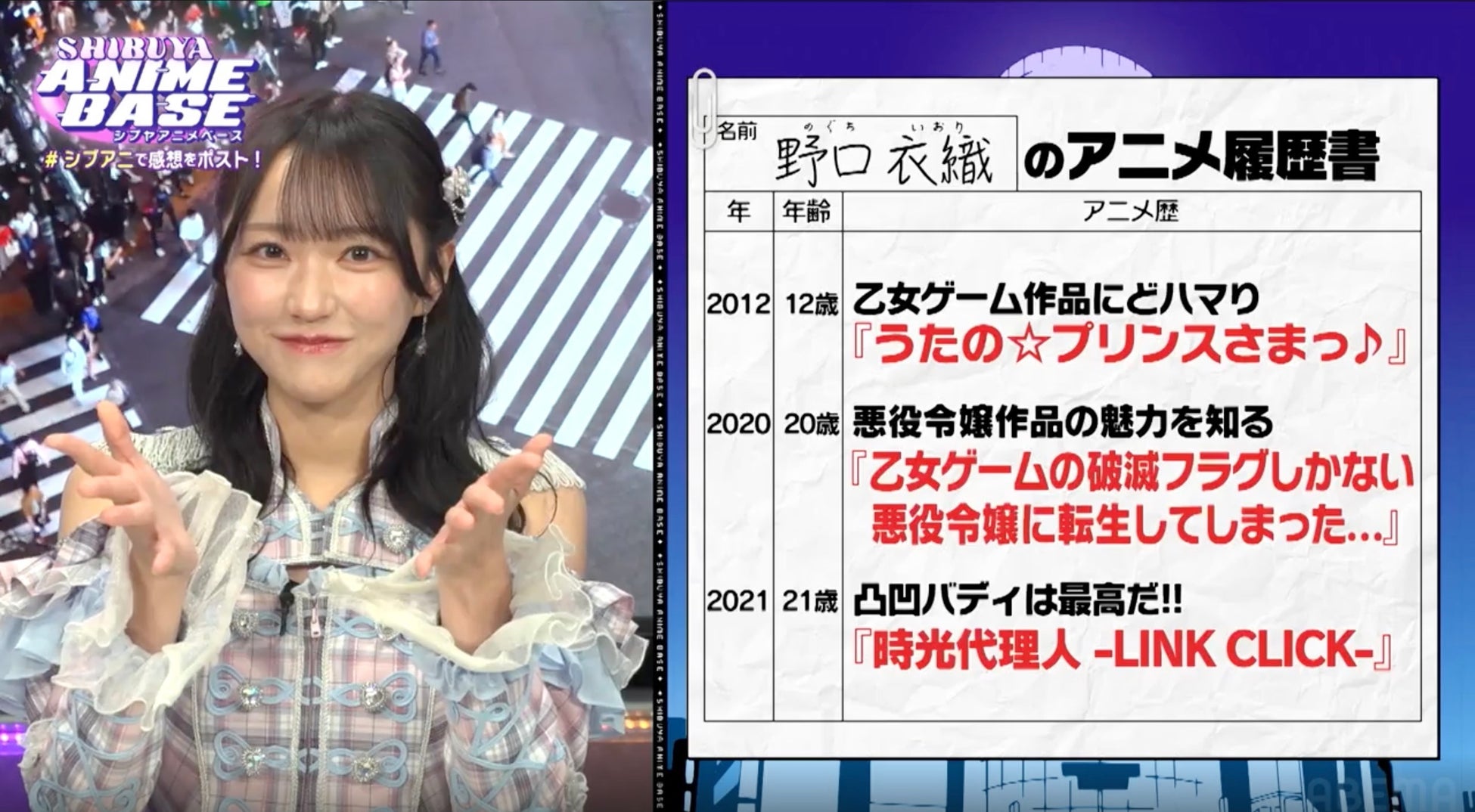 #31は、ゲストのアニメ遍歴を履歴書形式でお届けする『私のアニメ履歴書』のコーナーにてゲストのアイドルグループ=LOVE・野口衣織さんのアニメ遍歴を振り返ります。