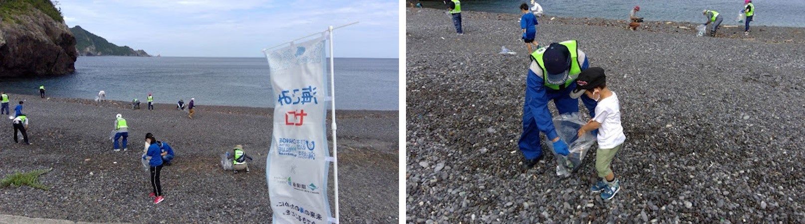 開会式の会場には、海ごみゼロ維新プロジェクトが海洋ごみゼロを呼びかける看板やのぼり旗を設置しました。この日、長門市では市内11か所の海岸で清掃活動を行いました。市内仙崎の青海島にある静ヶ浦一帯でも参加者が不燃ごみと可燃ごみに海洋ごみを分別しながらごみ袋に回収していました。