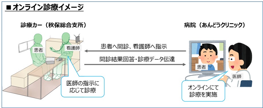 2023年2月1日~3月31日、4者は連携して、将来想定される医師不足や高齢化に対応するために 「患者側と医療側の双方にとって、より受け入れやすい簡便なオンライン診療」を普及させることを目的とした実証※1を行いました。 具体的には、看護師が医療機器を搭載した診療カーを用いて、患者を訪問・診療補助するオンライン診療モデル (DtoPwithN型※2 )を採用し、各種医療機器や通信環境の適用によるオンライン診療の質的効果の技術検証、その有効性の評価を行いました※3。実証より、次の結果や課題が得られました。
