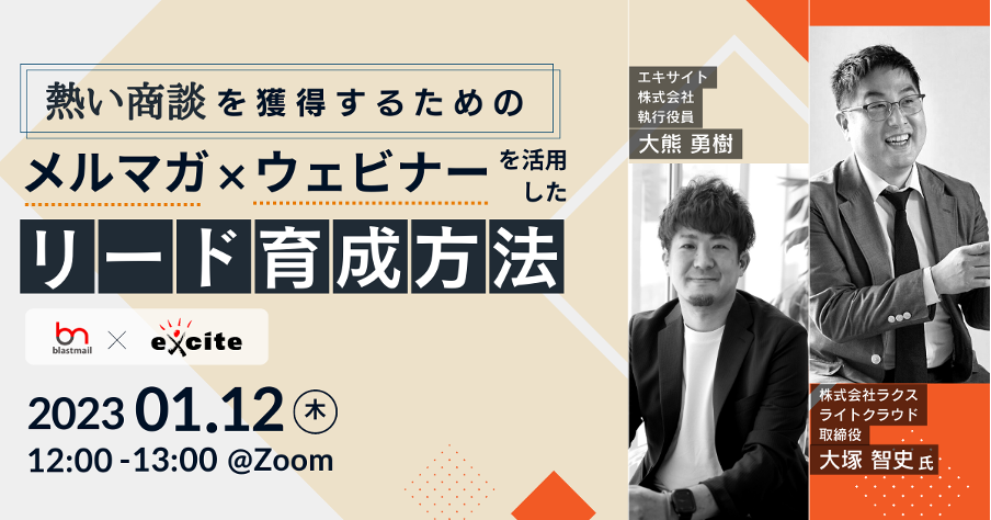 エキサイト株式会社(所在地:東京都港区、代表取締役社長:西條 晋一)は、株式会社ラクスライトクラウド(所在地:東京都渋谷区、代表取締役:浅野 史彦)と共同で「熱い商談を獲得するための メルマガ×ウェビナーを活用したリード育成方法」をテーマに2023年1月12日(木)12:00〜より参加費無料のウェビナーを開催します。