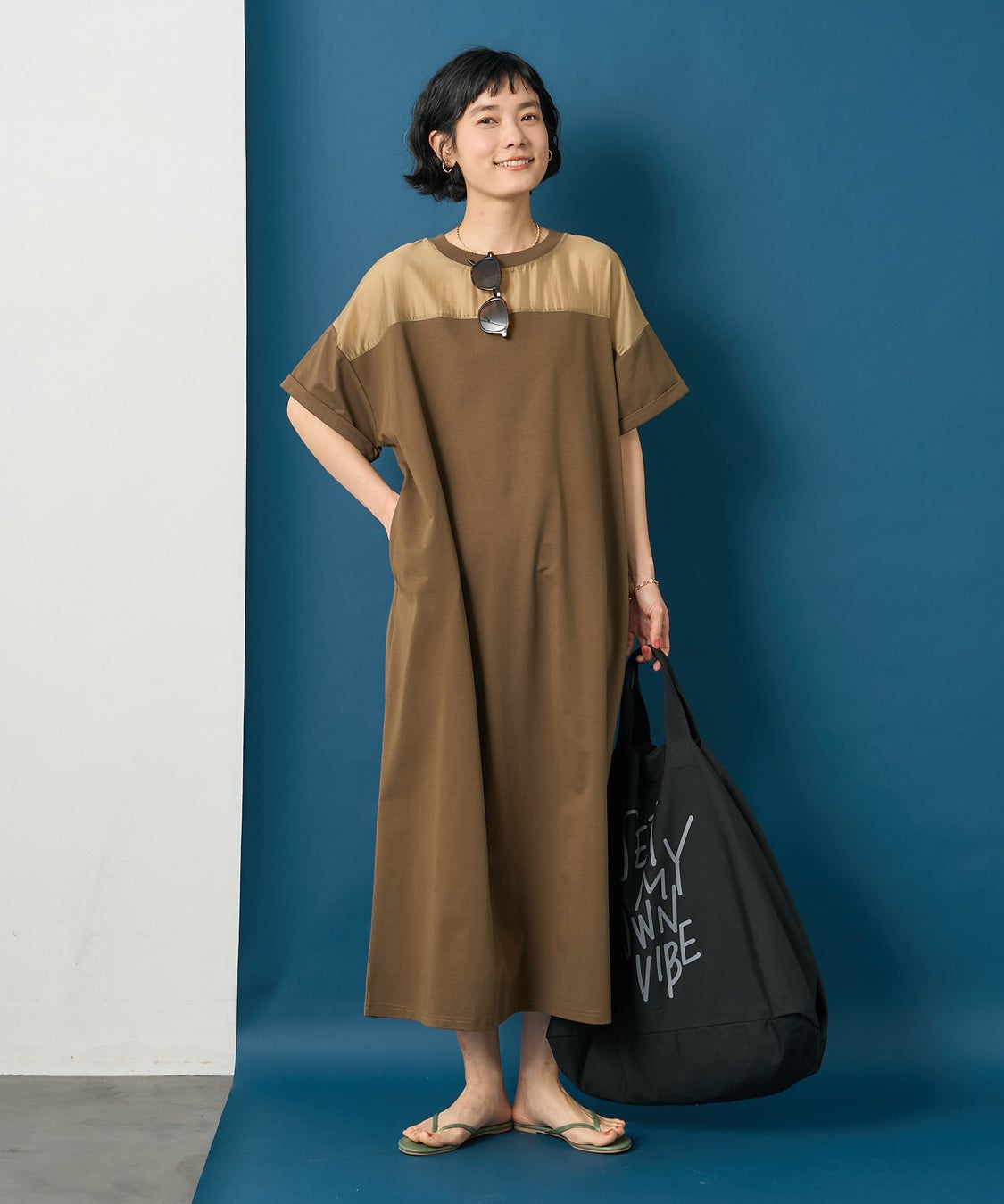 爽やかな肌ざわりが心地よいコットン天竺素材をメインに、1枚で着映えする異素材切り替えのデザインに仕上げました。