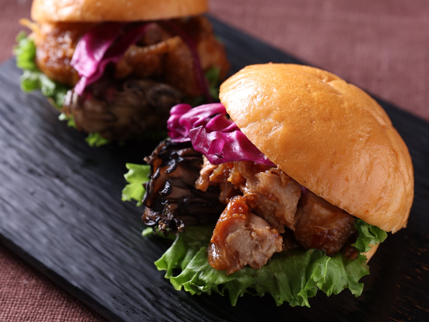 埼玉県産黒舞茸にガーリックを効かせた照り焼きチキンが相性抜群のバーガーを是非お召し上がりください。