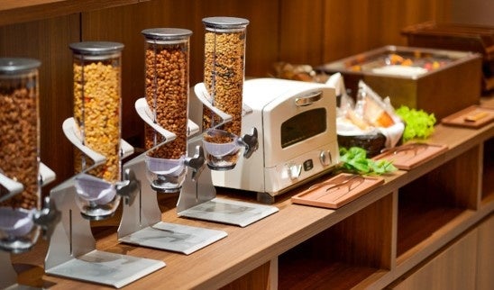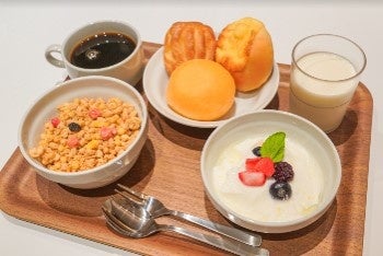 1日のスタートである朝食にこだわり、健康志向が高まっている現状を鑑み、朝食にはタンパク質・炭水化物・脂質のバランスを意識したシリアル・グラノーラを中心としたメニューをご用意いたしました。様々な種類をご用意し、バリエーションをお楽しみいただくと共に、連泊のお客様にも飽きがこないよう工夫いたしました。忙しい朝でもあまり時間をかけずにお召し上がりいただけるメニューですが、ゆっくりと朝食を楽しまれたいお客様はテイクアウトいただき、客室でお召し上がりいただくことも可能です。
