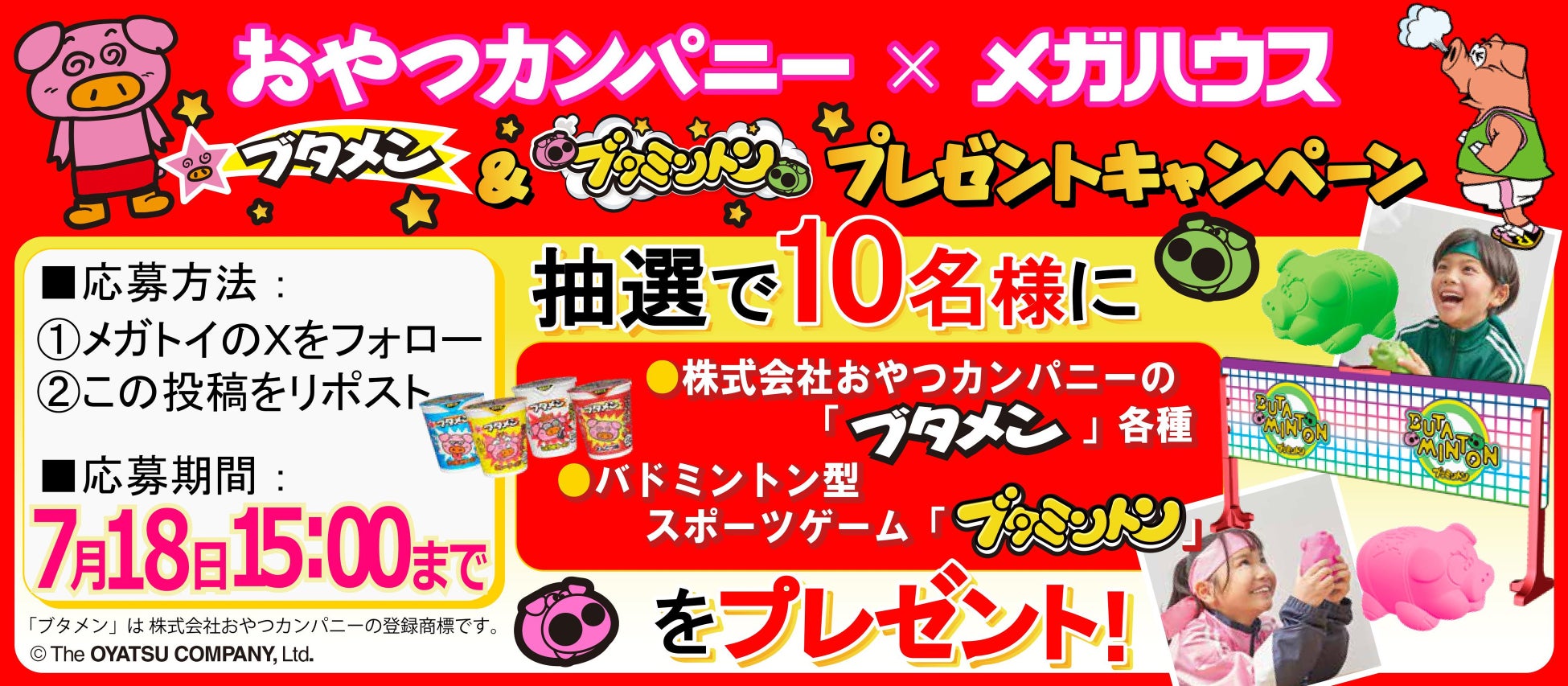 今回のコラボレーションでは、おやつカンパニーの人気キャラクター「ブタメンくん」が初登場!メガハウスの新製品「ブタミントン」の発売を記念した、両社のユニークで可愛いブタさんのコラボレーション動画を制作し、その動画をYouTube、Xにて配信し、さらにXではプレゼントキャンペーンも実施いたします。