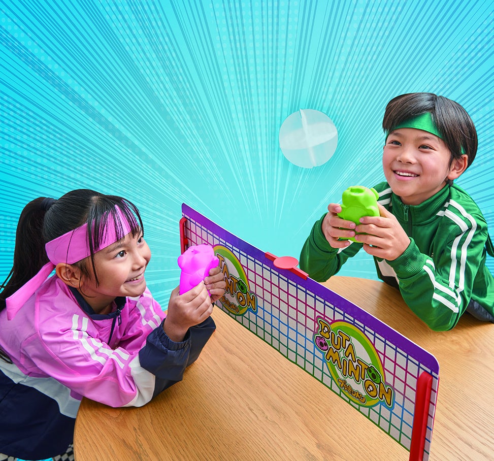 あの昭和~平成の名作玩具「ブタミントン」が令和時代に復活!「ブタミントン」は思わず熱中しちゃうバドミントン型対戦スポーツゲーム。ブタを押して鼻から空気を出して、羽根を飛ばし合い、相手側のコートに羽根を落とすと1点獲得となり、先に10点先取した人が勝ちです。2人(1対1)もしくは4人(2対2)の対戦が可能です。