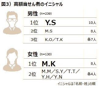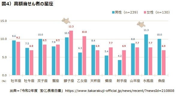 高額当せん者のイニシャルを調べると、男性は「Y.S」さん、女性は「M.K」さんが最も多くなっています。例えば、男性だと名字はサトウさんやスズキさん、名前はヨシオさんやユウタさん。女性はクドウさんやカトウさん、マサコさんやミヨコさんなどです。また、生まれた日の星座で見ると、男性は「水瓶座」(1/20~2/18)、女性は「獅子座」(7/23~8/22)が最も多くなっています(図3,図4)。