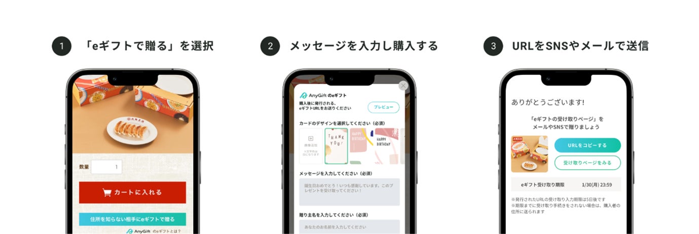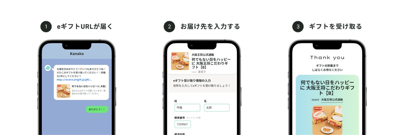 「AnyGift」をご利用いただくと、商品購入時に受け取り主専用のURLが即時発行されます。このURLは、LINEやメールを通じて簡単に共有でき、住所を知らなくてもギフトを贈ることが可能です。受け取り主は、このURLを利用して配送先や希望の配送日を選択できるため、冷凍配送にありがちな受け取りタイミングに関する不安やトラブルを回避できます。また、贈り主名とメッセージを添えたメッセージカードも提供しており、「大阪王将」の本格中華とともに、感謝の気持ちや温かな思いをお届けすることができます。