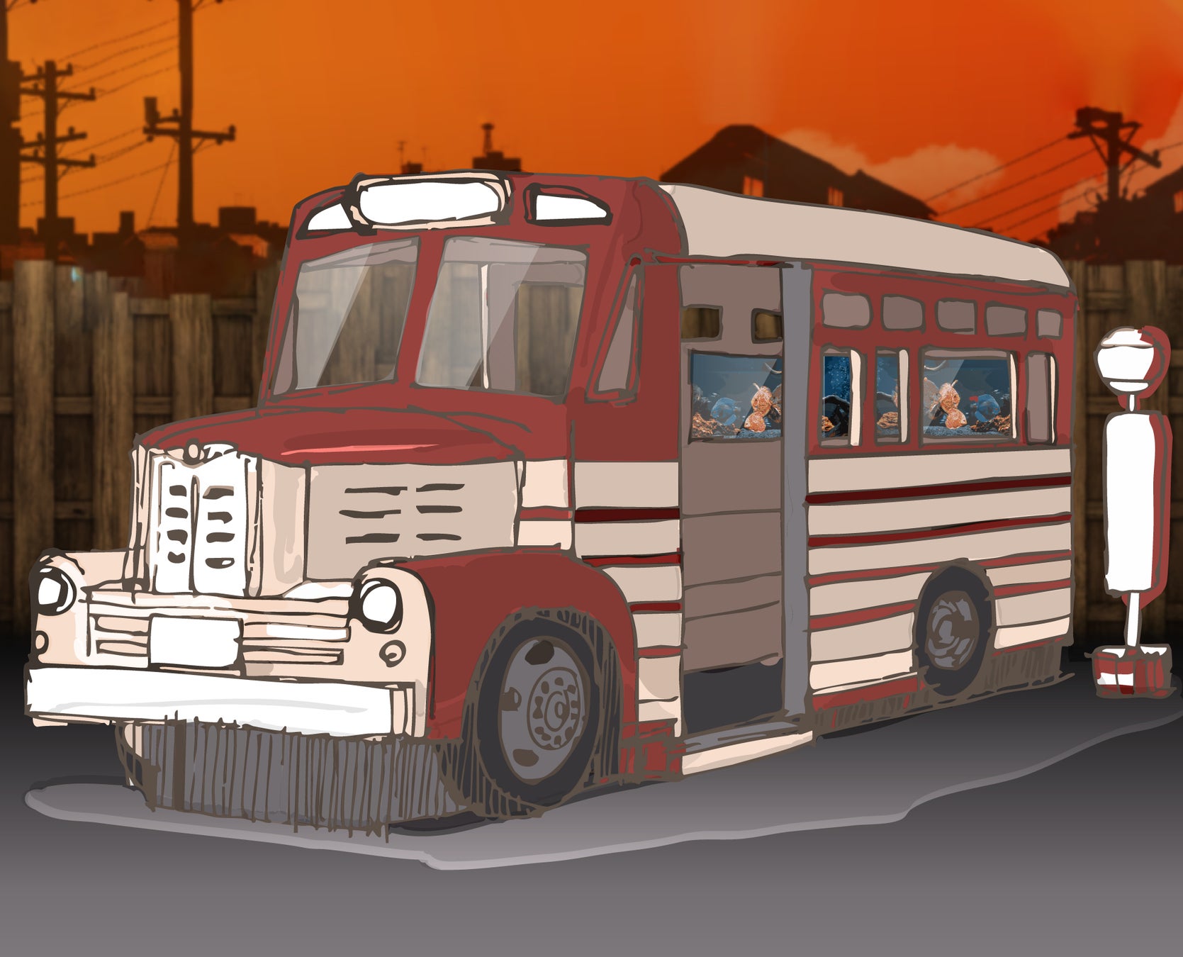 商店街を抜けると、そこにはゲストの乗車を待つバスの姿。車窓から広がる空を生きものが悠々と泳ぎます。どこか懐かしく不思議な原風景を感じる事ができるタイムトリップバスです。
