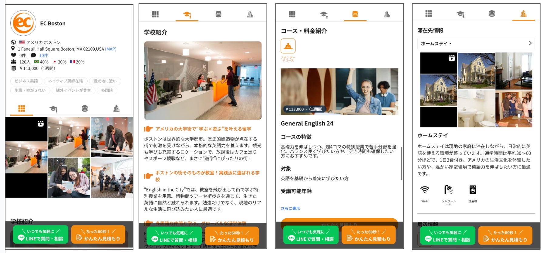 ネイティブキャンプ留学では、ユーザーが必要な情報を分かりやすく把握できるよう、常に丁寧で明確な情報提供を心がけています。EC Bostonの詳細情報は、以下の4つのカテゴリーに分けて掲載しており、知りたい情報を的確にお届けします。