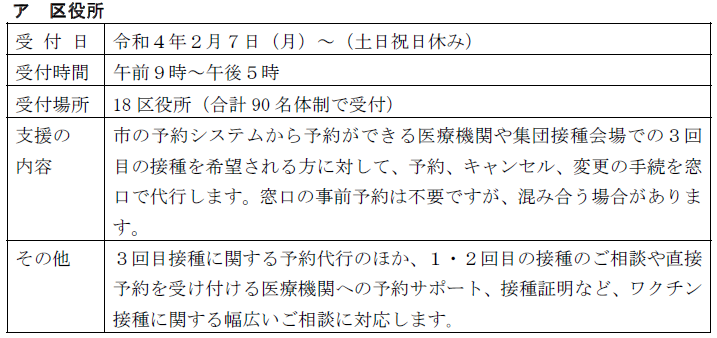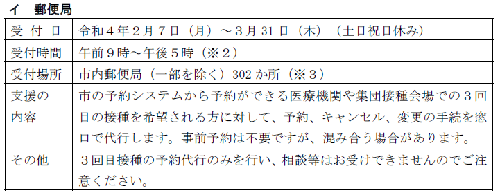パソコンやスマートフォン等をお持ちでないなど、インターネット(Web)での予 約が困難な方を対象に、区役所相談員や市内郵便局(一部を除く)がその場で予約 を代行します(※1)。個別通知(接種券含む)を忘れずにお持ちください。