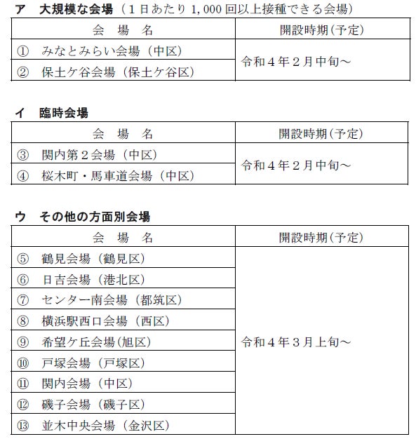 | (予約方法) 1・2回目と同じく、原則、接種は事前予約制です。 接種券が届いた方から、接種の予約ができます。 ●市が予約を受付ける接種場所 1・2回目と比べて、市が予約を受付ける医療機関が順次増えていますので、 予約専用サイト(Web)からの予約を推奨しています。 ① 予約専用サイト(Web) https://v-yoyaku.jp/141003-yokohama (受付時間 9 時 00 分から 23 時 59 分) ② 市公式 LINE 「横浜市 LINE 公式アカウント」を友だち登録(2月9日(水)~) (受付時間 9 時 00 分から 23 時 59 分) ※ LINE から予約に関するアカウント情報の登録をすると、予約専用サイ トからの予約は できなくなります。 ③ 予約センター(電話) 0120-045-112 (午前9時から午後7時まで土・日・祝祭日も受付) ※ 電話のおかけ間違いにご注意ください。 ●直接、予約を受付ける医療機関 区ごとの接種を受けられる医療機関一覧を個別通知に同封しています。 それぞれの医療機関の予約方法は、医療機関一覧をご確認ください。 |