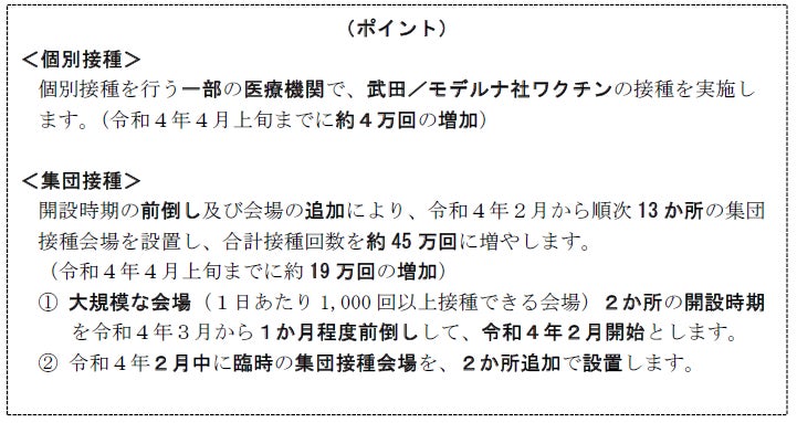 集団接種会場を 13 か所設置し、全て武田/モデルナ社のワクチンを使用します。
