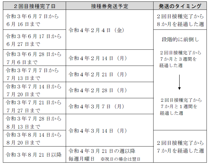 初回接種の完了から7か月以上経過した後に追加接種を実施することができる。