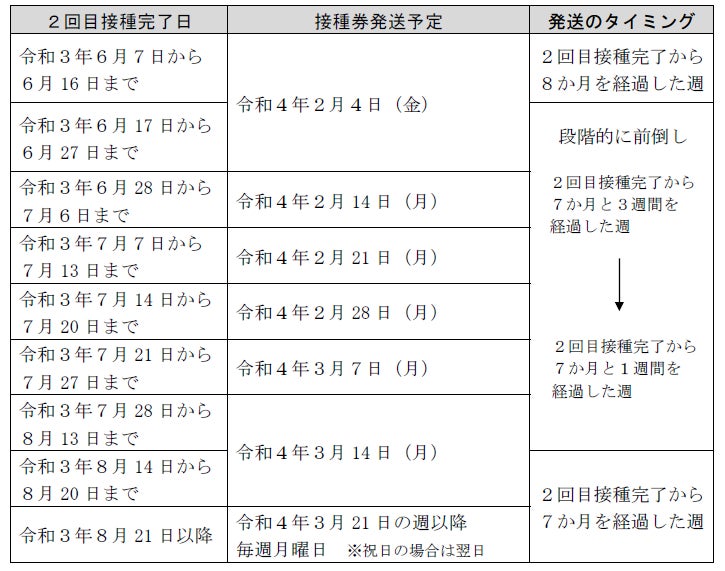 新型コロナウイルスワクチンの追加接種(3回目接種)について、横浜市では既に医療従事者等及び高齢者施設入所者等を対象に前倒し接種を進めています。このたび、さらにワクチン接種を加速します。その他の高齢者(65 歳以上)の3回目の接種間隔について、原則2回目接種完了から8か月以上経過した方としていましたが、新たな変異株の感染拡大防止策等として、接種間隔を前倒しします。