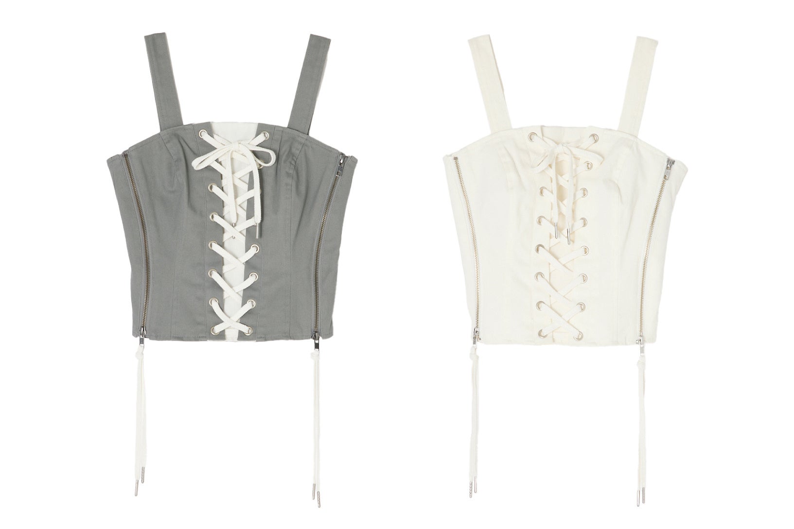 本人こだわりのコルセットは、フロントのレースアップに採用したシューレースやサイドに施したジップがどこかカジュアルな表情が宿らせる。