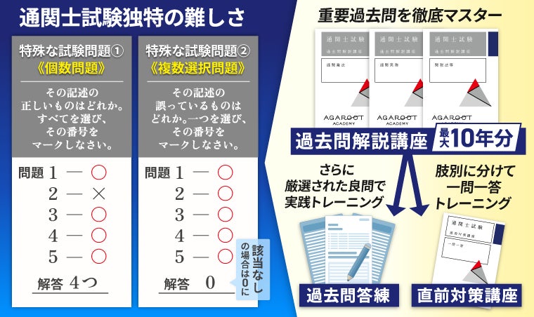 通関士試験は、問題の出題形式が特殊な試験です。正解の記述を全て選ばせる「複数選択問題」や、「該当なし」の場合は解答欄に「0」をマークさせる五肢択一式問題など、特殊な出題形式があるため、知識があっても問題が解けないという人が多いのが実情です。アガルートでは、最大10年分の過去問をご用意し、解法についても講師が丁寧に、順を追ってご説明します。