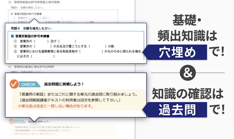 本講義で用いるテキストは、すでに基礎知識があることを前提に、あえて詳細な説明を省略。基本的な論点や試験における重要度が低い箇所では、すぐに実践的な「空欄補充形式の演習問題」が出題されます。また、各問題には制限時間が設けられており、本番さながらの演習により「知っているつもり」の知識と何を補強すべきかが一目瞭然となります。さらに、随所に設けられた「過去問題への挑戦」を促すポイントで演習に移り、インプットした知識が実際の試験でどのように問われるのかを即座に確認することで、知識と実践力が結びつきます。章末問題も完備しており、網羅的なアウトプットが可能です。