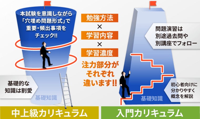 学習経験者が最短で合格レベルに到達するため、ムダな時間を徹底的に省いた効率重視のカリキュラムです。学習経験者ほど見落としや誤解がそのまま残っていることがあるため、本講座ではそれらを解消することで、これまで気づかなかった論点や盲点を丁寧に拾い上げていきます。