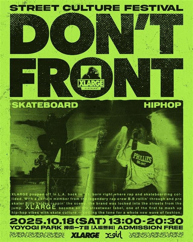 株式会社ビーズインターナショナル(本社:東京都目黒区、代表取締役社長:西方雄作)が運営するストリートブランド「XLARGE(エクストララージ)」と「X-girl(エックスガール)」は、2025年10月18日(土)にストリートカルチャーイベント『DON’T FRONT』を都立代々木公園BE STAGEにて開催いたします。