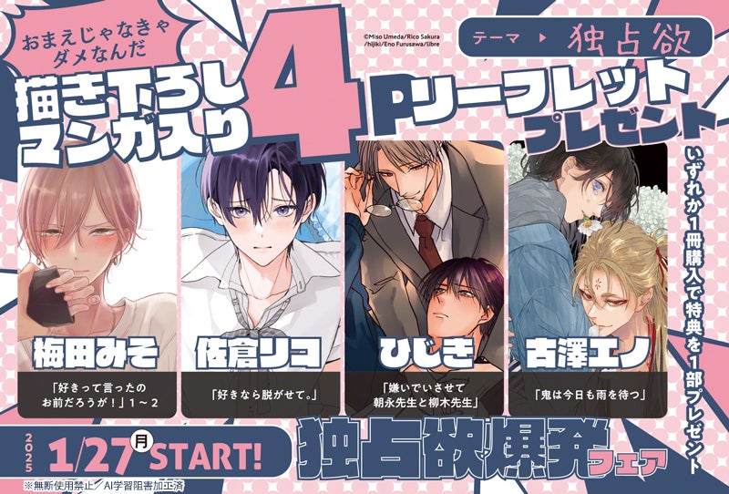 梅田みそ・佐倉リコ・ひじき・古澤エノによる「独占欲」がテーマの描き下ろしマンガ入り4Pリーフレットプレゼント!!