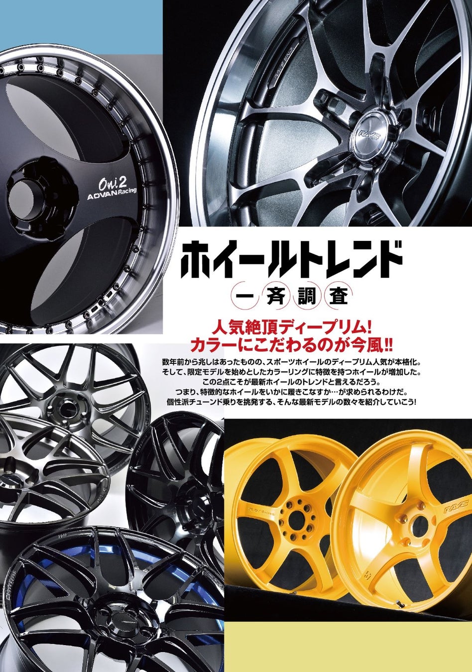 さらに、第2特集は東京オートサロンで発表された最新モデルを中心に展開する『ホイールトレンド一世調査』。スポーツホイールの流行である、[ディープリム]と[カラーへの拘り]について迫りながら、いまホイールメーカー各社が取り組んでいる[復刻モデル]もチェックしていく。