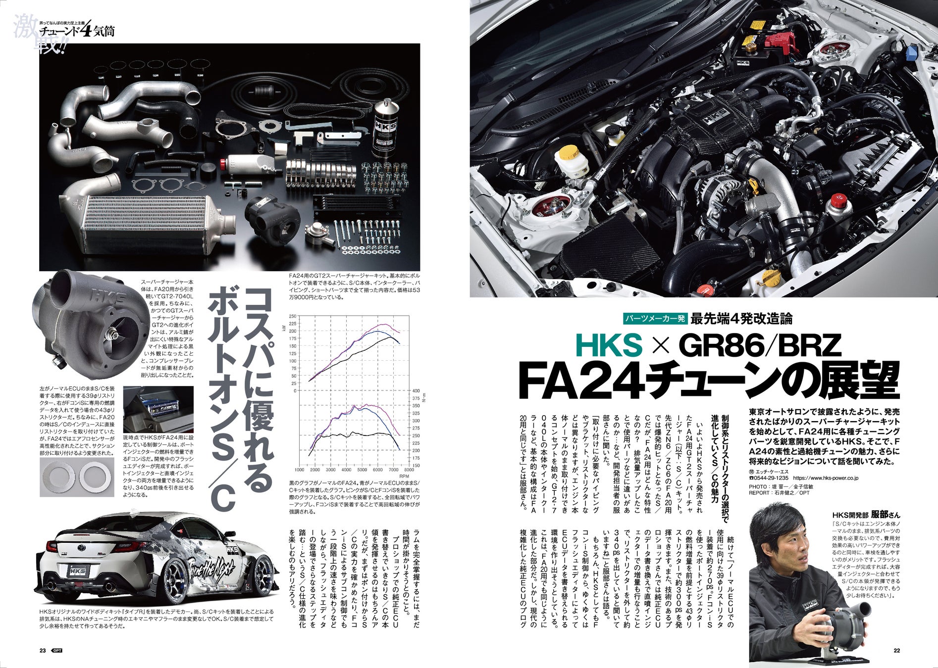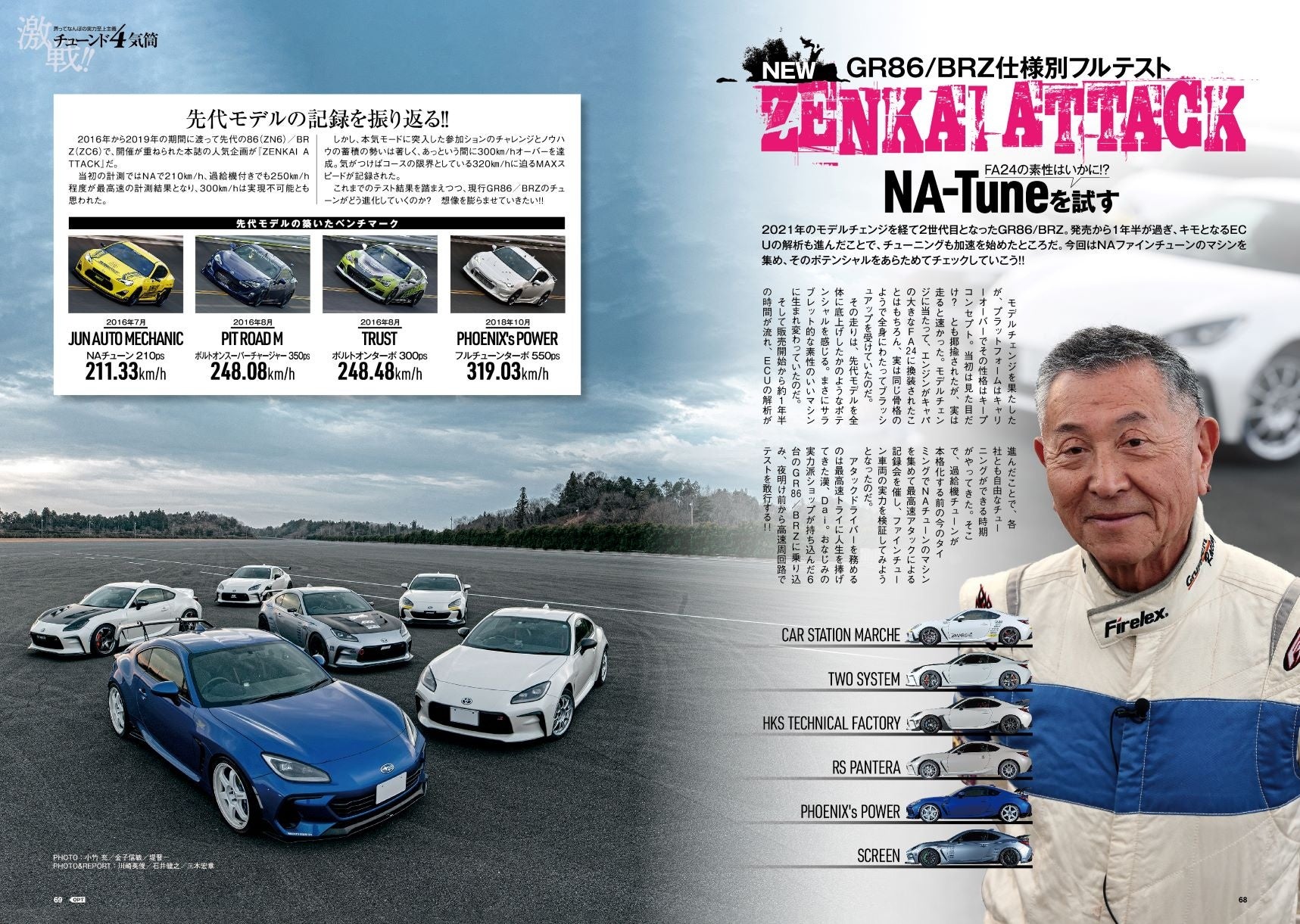 巻頭特集は、4気筒スポーツモデルの改造論がテーマだ。FA24やK14C、K20Cを搭載する最新車種の情報はもちろん、色褪せない人気と実力を誇る絶版マシンの魅力を引き出す匠の技も必見! 他にも国産4気筒エンジンの年表、史上最強4気筒エンジンの物語、GR86/BRZのNA仕様に限定した最高速テストに加えて、Attack筑波で大躍進した4気筒タイムアタッカー、NOB谷口によるラテン系ホットマシンのインプレなど、取り上げているトピックは古今東西、まさに激戦区!! 4発チューンドの魅力を多角的に検証していこう。