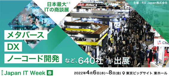 RX Japan株式会社(本社:東京都新宿区、代表取締役社長:田中 岳志)は2022年4月6日(水)~8日(金)の3日間、東京ビッグサイト 東ホールで「第31回 Japan IT Week 春」を開催します。