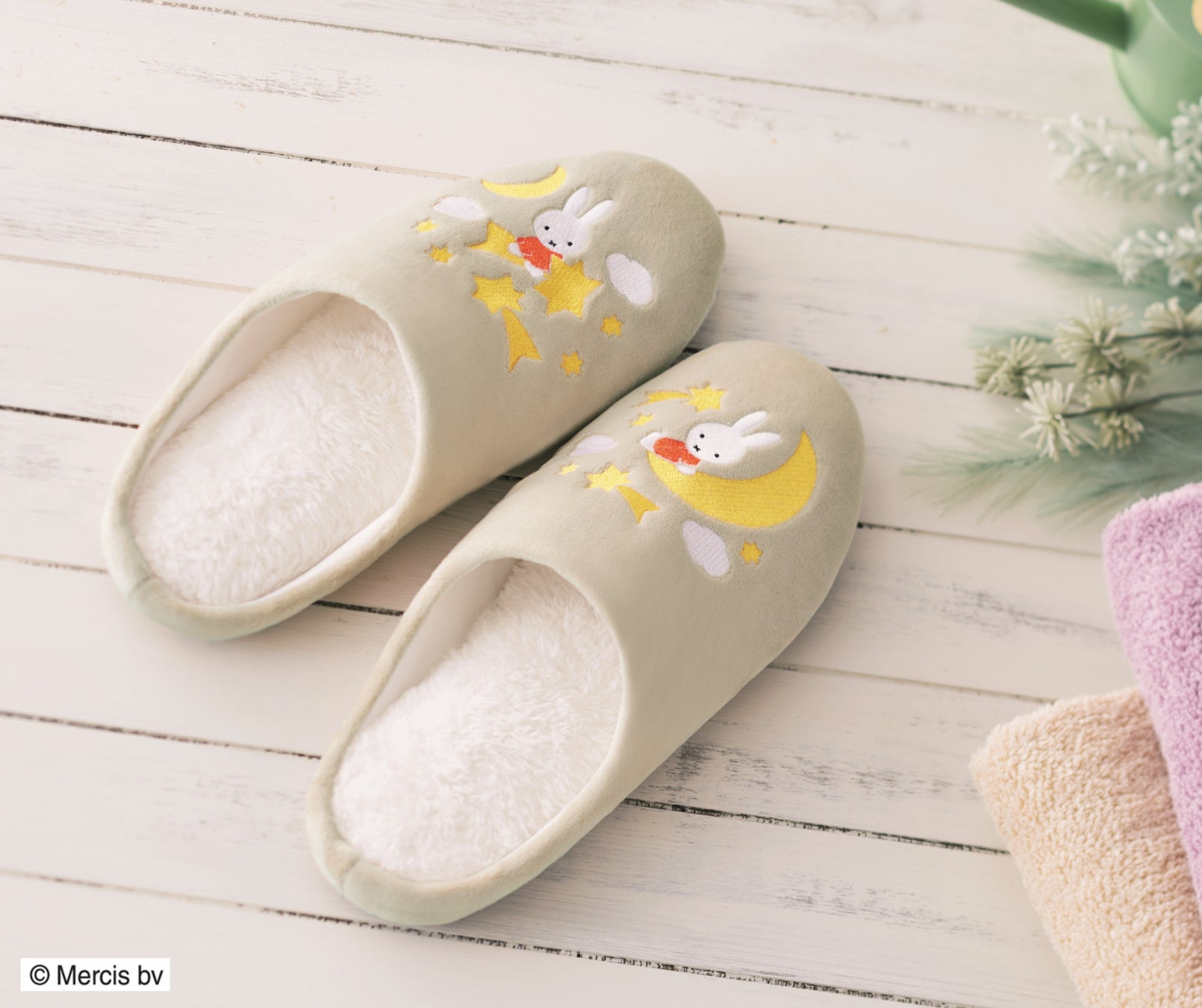 ミッフィーの刺しゅう入りのふんわりスリッパは、気持ちの良い素材で履き心地がバツグン。自宅で簡単に手洗いできます。かわいい刺しゅうを眺めるだけで、おうち時間も楽しくなります!